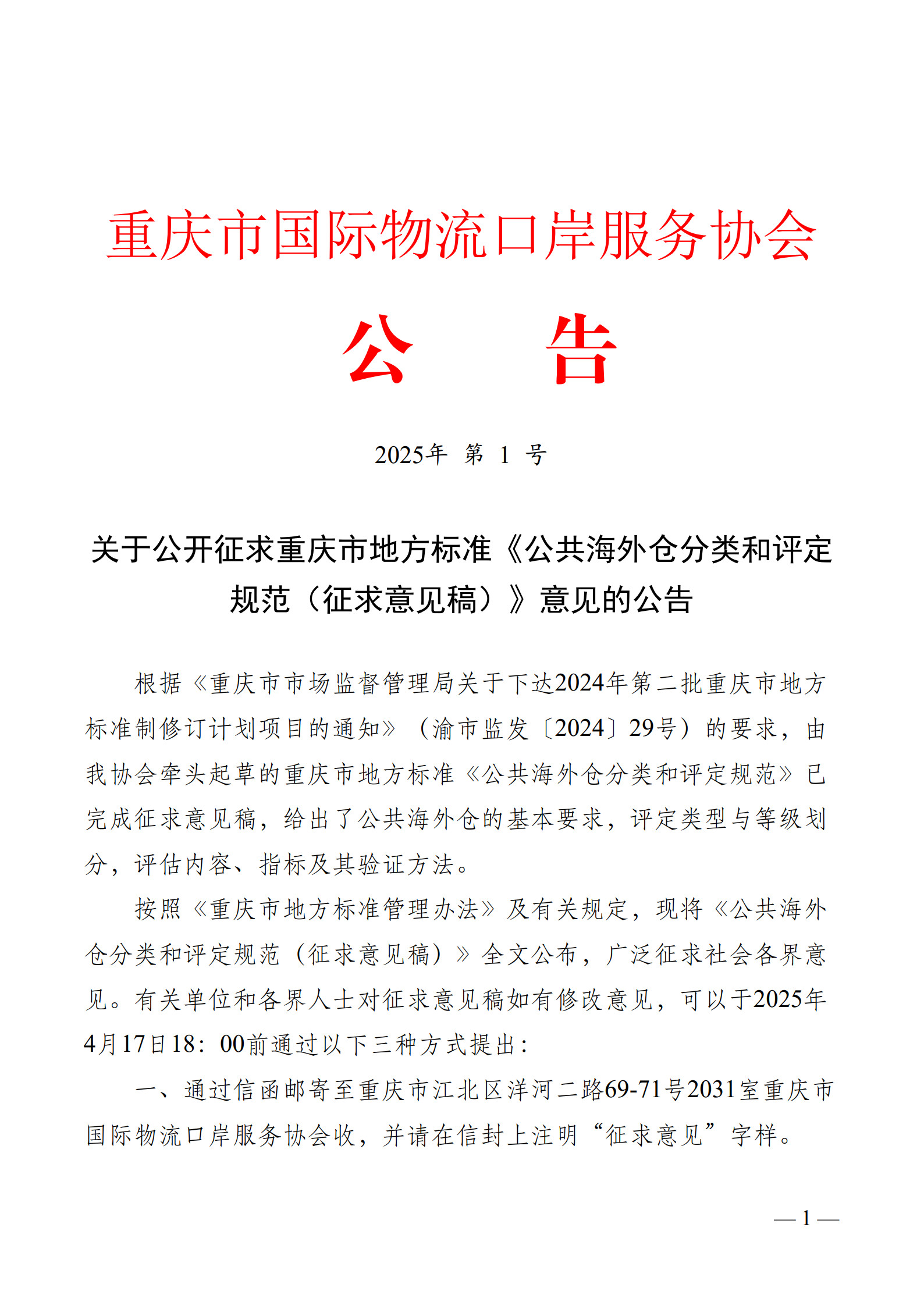 关于公开征求重庆市地方标准《公共海外仓分类和评定规范(征求意见稿)》意见的公告