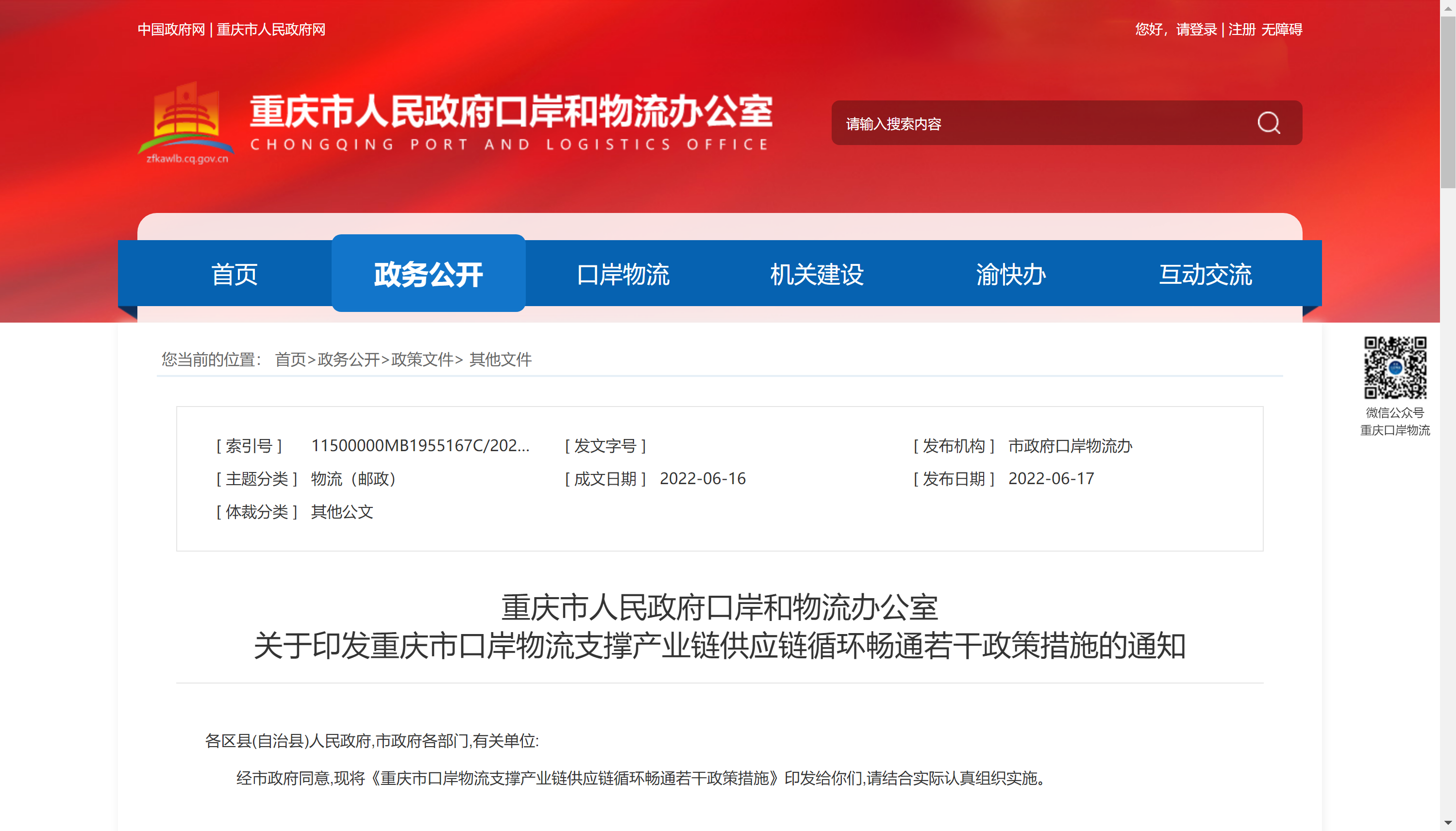 关于印发重庆市口岸物流支撑产业链供应链循环畅通若干政策措施的通知